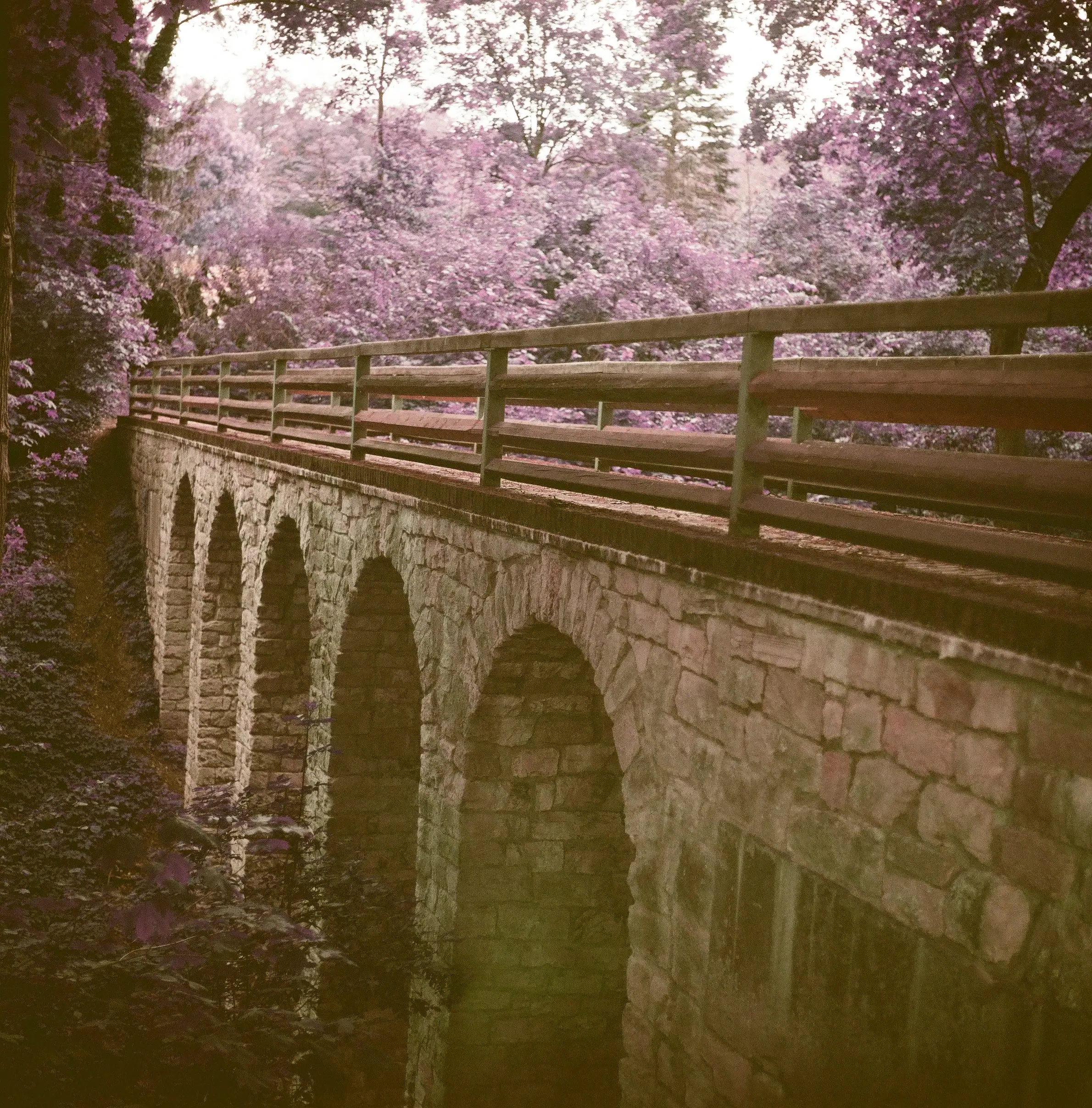 It’s fascinating how a bridge built for soldiers and drainage now stands as a quiet, almost enchanted spot - especially when seen on a picture made with Lomochrome Purple.
