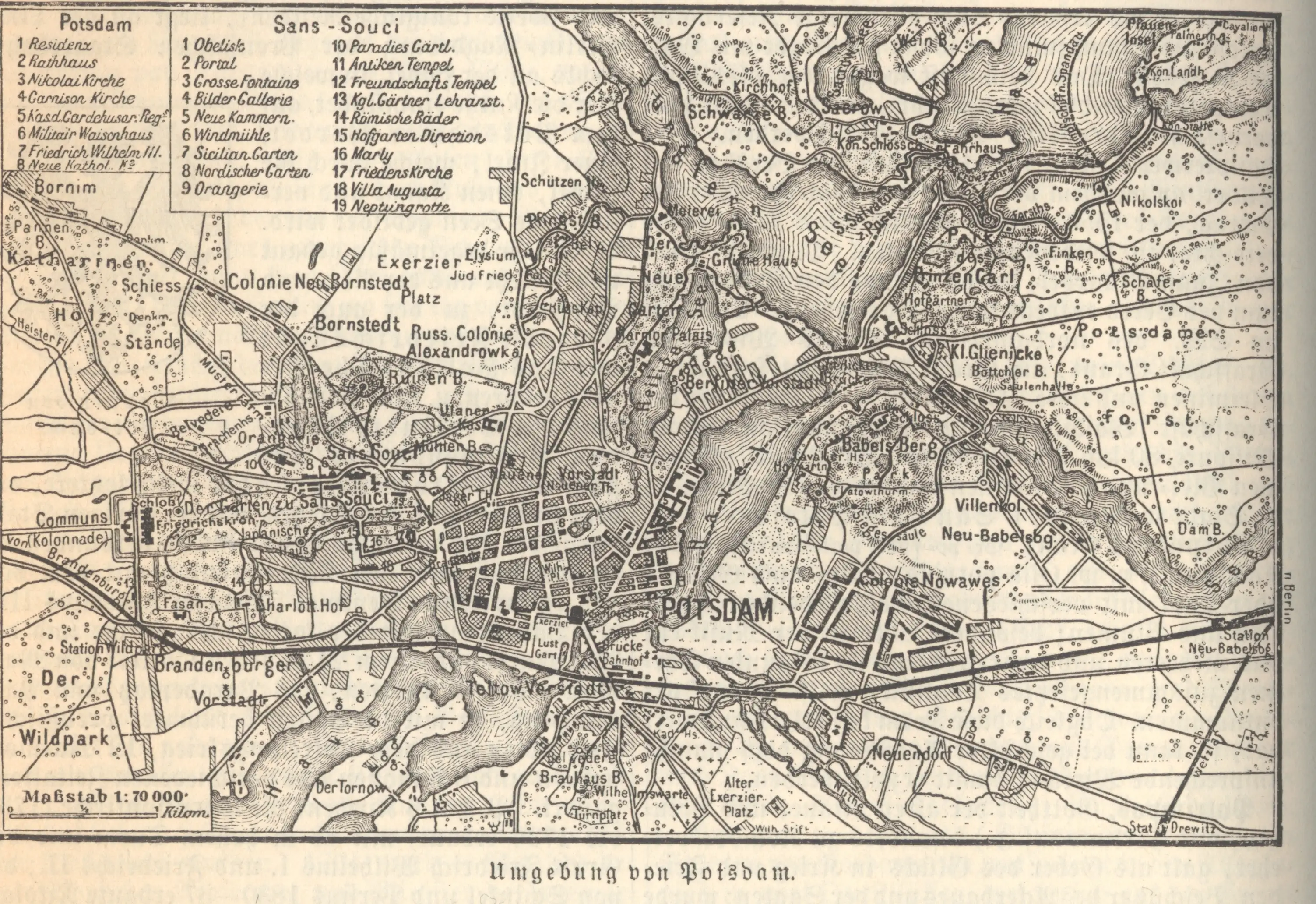 Map of Potsdam from around 1890. You can see the Schießstände mentioned in the upper left of the map. Printed in Meyers Konversations-Lexikon. Eine Encyklopädie des allgemeinen Wissens / 4. Auflage (1885–1890/1892)