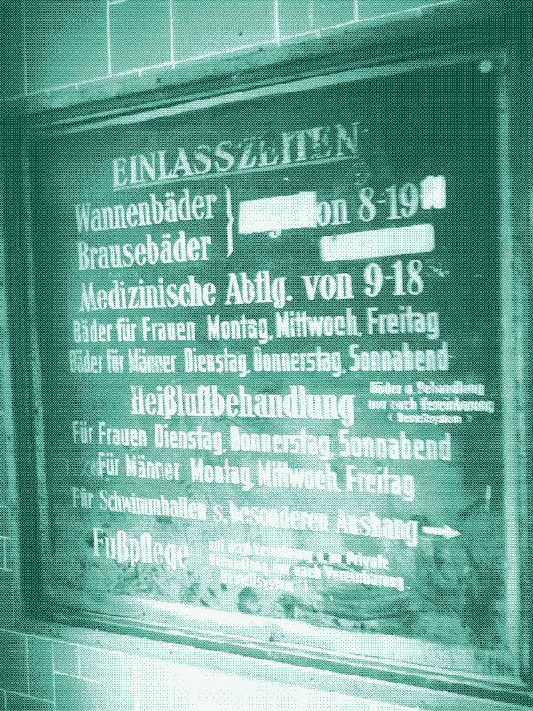 This year on the Open Monument Day (“Tag des offenen Denkmals,” an annual event in Germany that allows the public to visit historic buildings and sites not usually open to the public) i took the opportunity to visit the old Stadtbad Lichtenberg. I heard some stories about it, but i never saw it from the inside (i simply was too young). It was designed by the Lichtenberger Magistratsbaurat Otto Weis with two swimming pools for men and woman, showers and bathtubs, gymnastics room with massage rooms, a sauna and sunbathing on the roof as well as medical baths. The bath opened as the “Städtisches Volksbad” in 1928, built in the style of expressionist architecture, and it closed it doors in 1991 due to various construction defects (the water treatment system and heating were ailing) and tight budgets.1